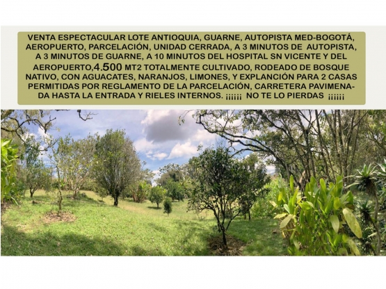 Venta de espectacular lote , antioquia, guarne, oriente antioqueño  a 3 minutos de la autopista Medellín Bogotá, por vía pavimentada, a 15 minutos del aeropuerto, y del túnel de oriente , a tan sólo 4 minutos del pueblo de guarne, lo cual permite estar muy cerca de todo lo que necesites,,, y en medio de vegetación y bosque. Por la cercanía a guarne el lote posee gran potencial de valorización a futuro ya que pasa a ser  urbano en medio de un oasis verde y de aire puro.